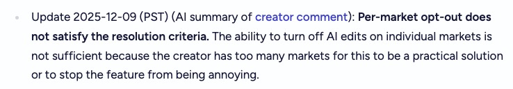 @IsaacKing and I’ll stop after this, I promise. But are you saying that this was always just a vibe based market? There was never any objective criteria, as they all hinged on whether you would still be annoyed? If Manifold had a dedicated button to disable this when you were making a market, would this still resolve NO because your were annoyed by having to remember to hit the button? If the AI description stopped entirely for all new markets, would it still resolve NO if you were annoyed by it continuing on 1k older markets you have? This seems to be your argument. So why not simply make the market about whether you’ll feel annoyed by manifold? The last clause shouldn’t negate the previous clauses though. . . . I don’t know. It’s just a really, very strange reading to me. . . I generally avoid purely subjective markets, but I guess you’re saying that this is one of them?